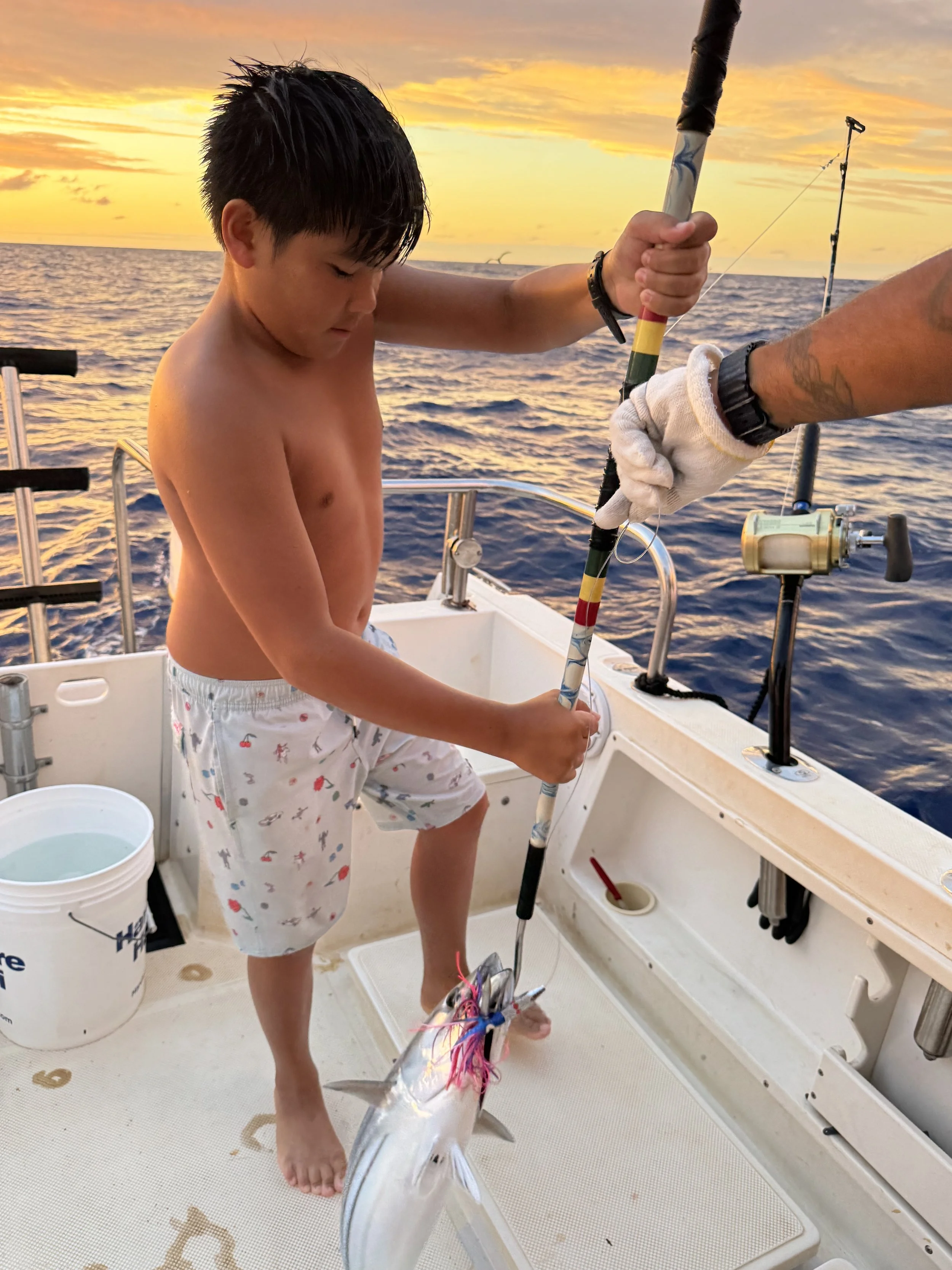 At Ocean Charters Kaua‘i, we use time-tested techniques and island know-how to target reef predators using live bait, chunk bait, specialty lures, and jigging—or head offshore to troll for pelagic species like ahi, mahi mahi, ono, and marlin. Whether it’s your plan or what the ocean conditions call for, we mix methods and read the water to create a solid, authentic day on the ocean.